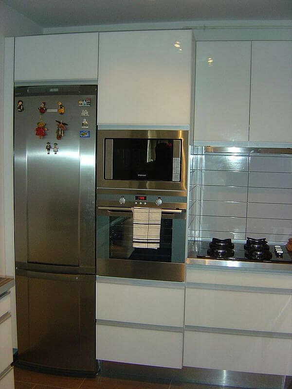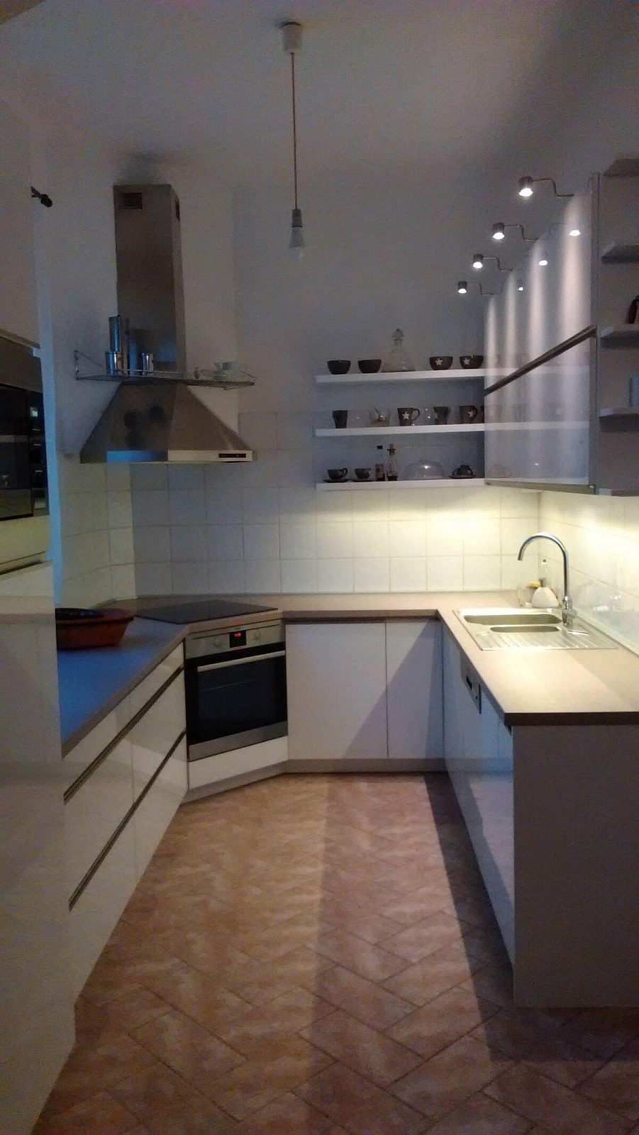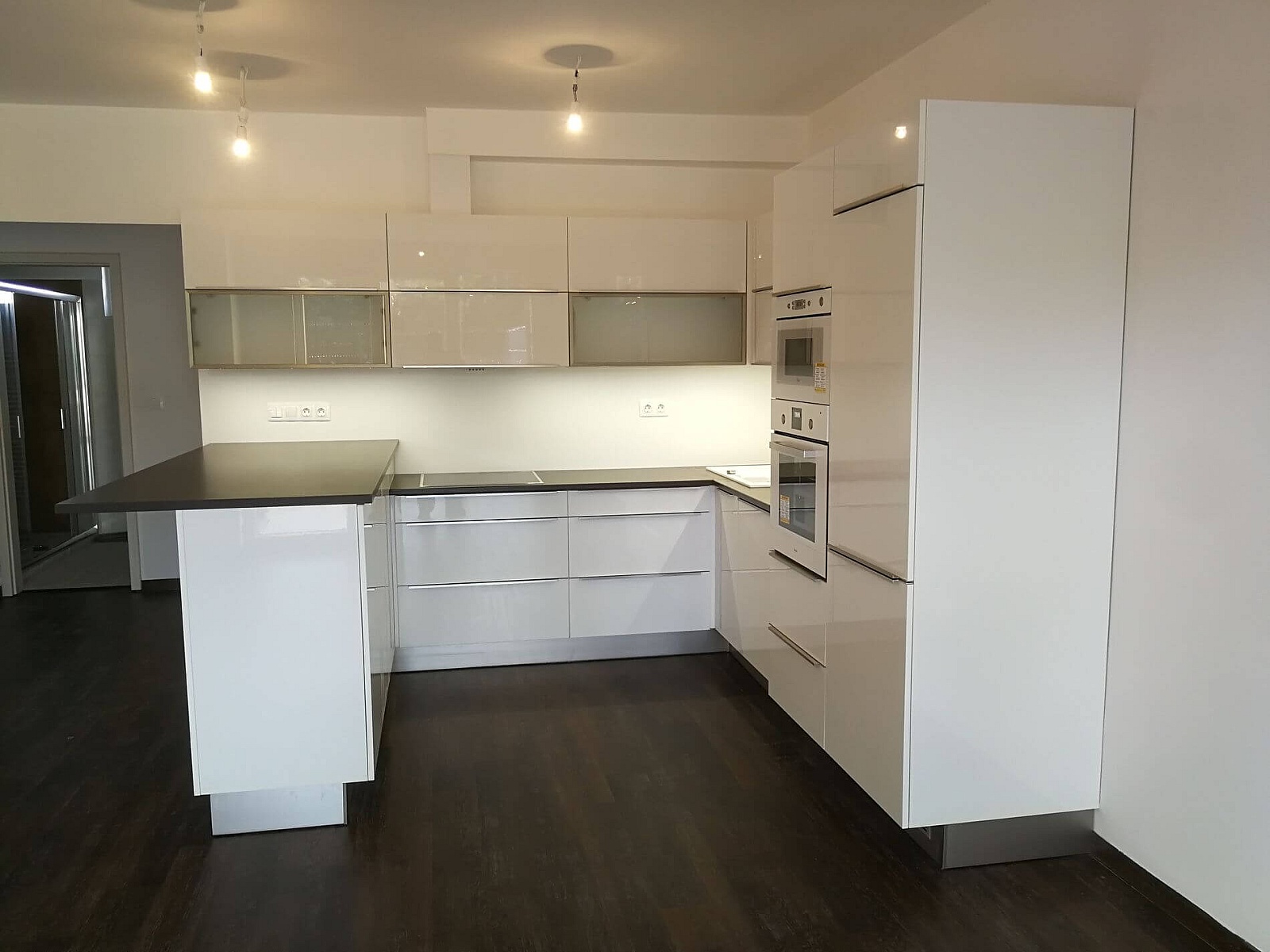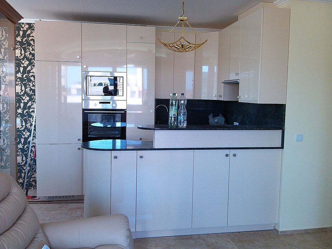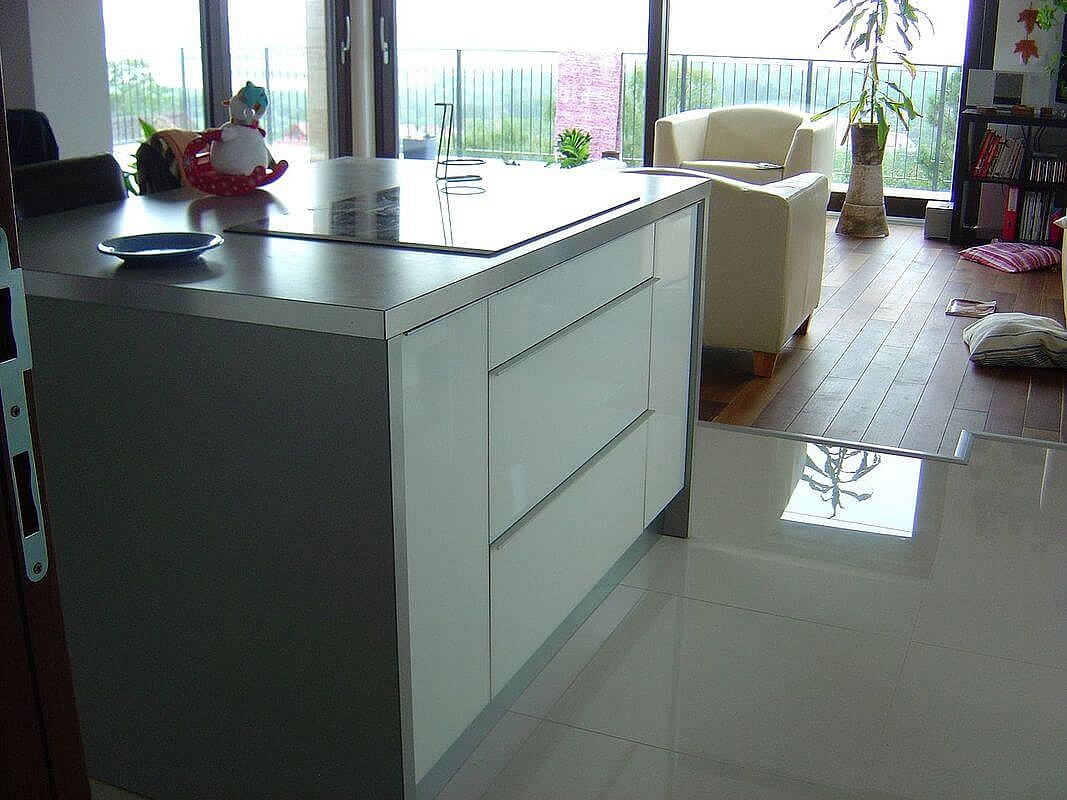 Fényes fehér akril ajtós modern konyhabútor élprofilos fogantyúval
