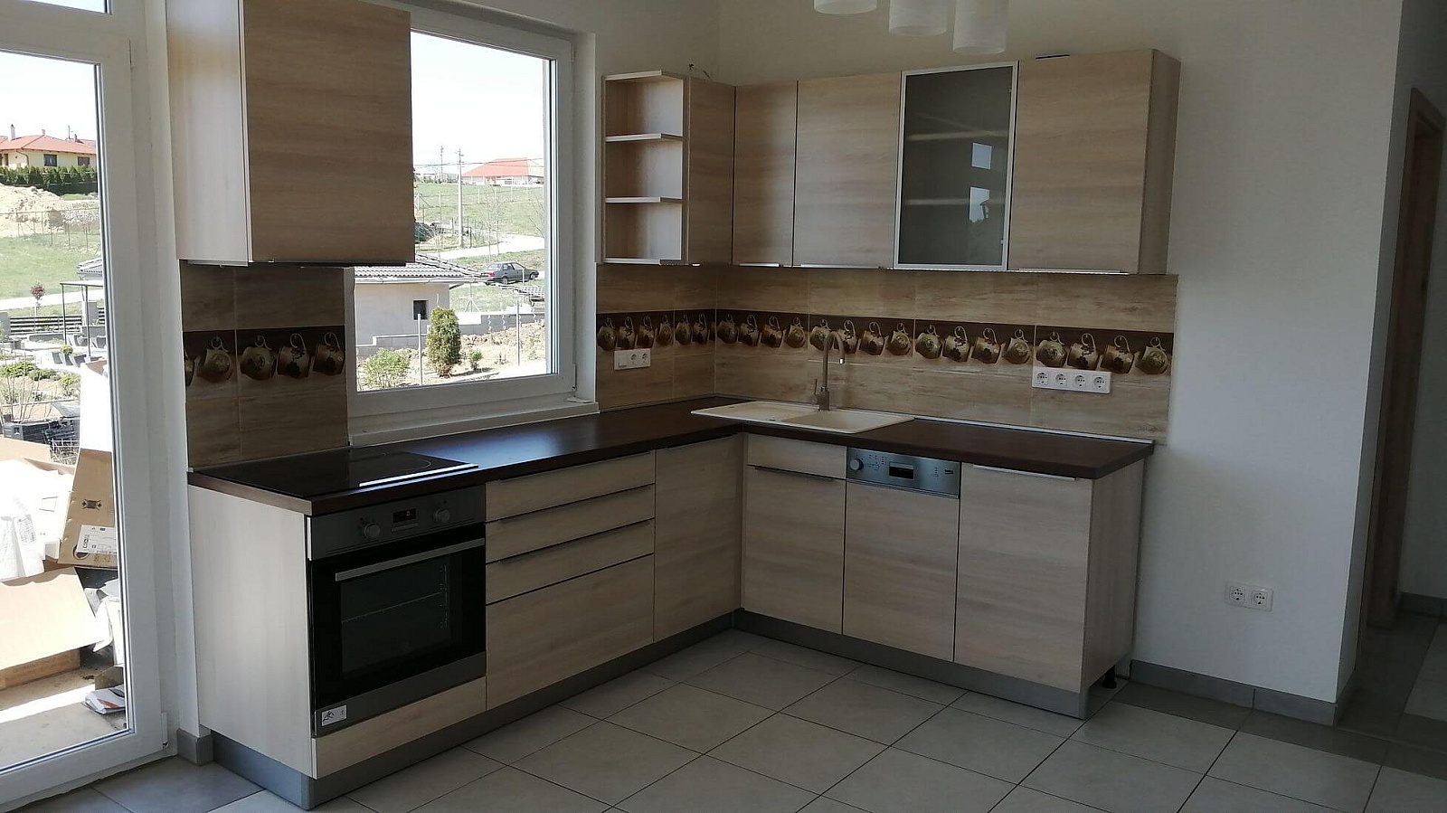 Modern Konyha Sötét tölgy kiegészítőkkel Fényes Beige ajtófronttal