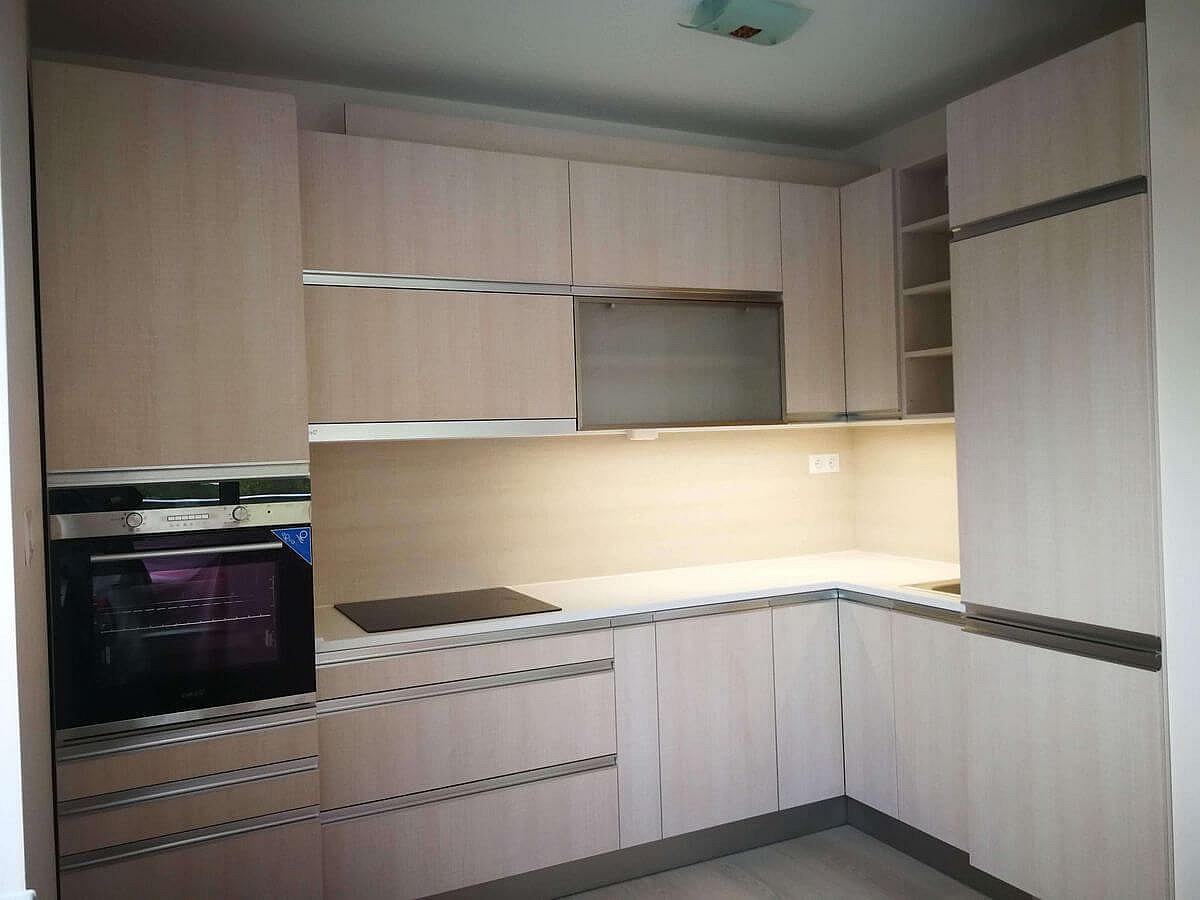Modern beige akril ajtós modern konyhabútor élprofilos fogantyúval