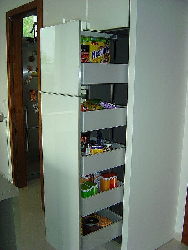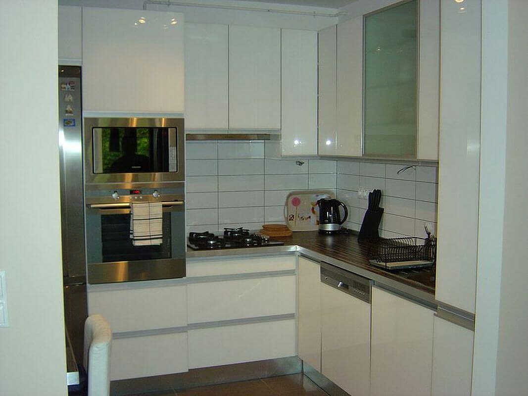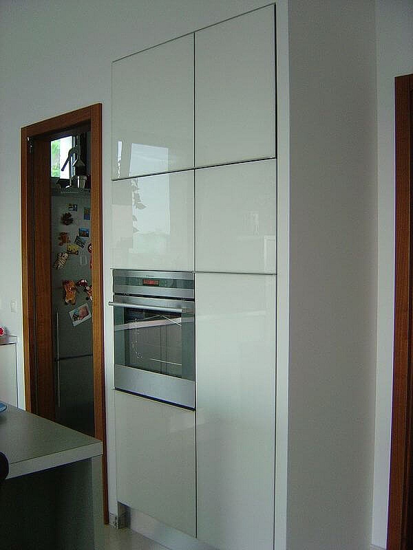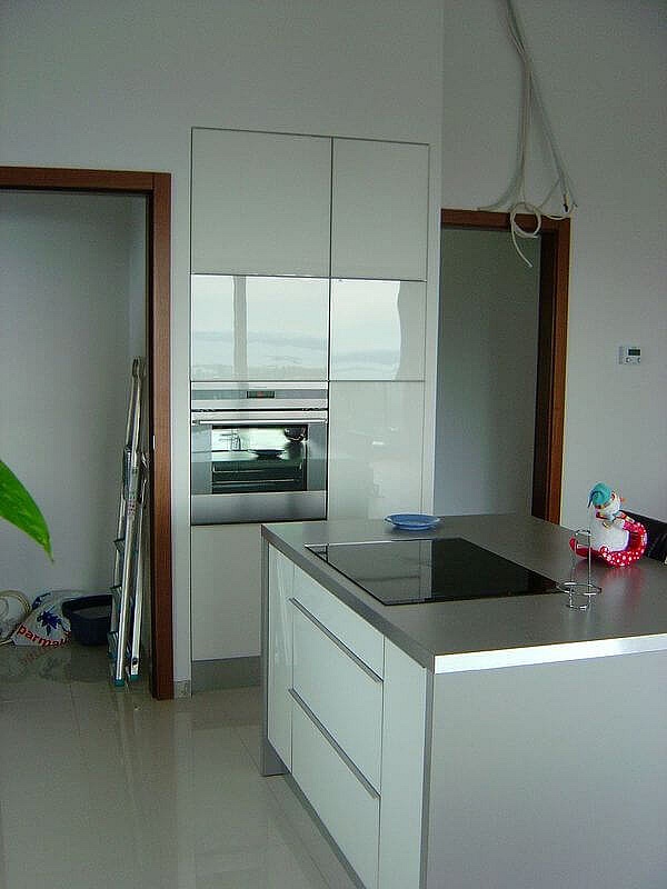 Fényes fehér akril ajtós modern konyhabútor élprofilos fogantyúval